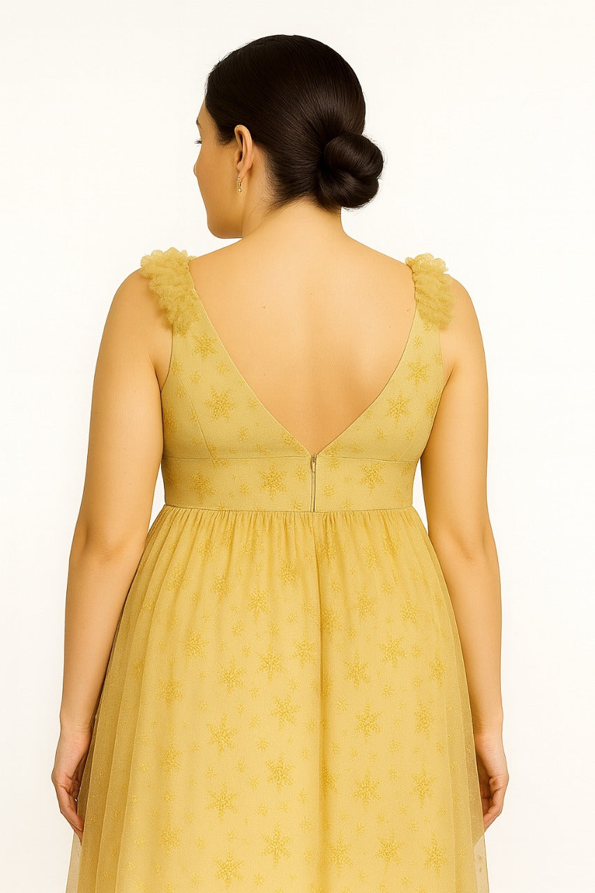 | This elegant gown features a deep V-neckline adorned with delicate ruffled detailing on the shoulders. The bodice is fitted, highlighting the waist with a textured, ruched design that transitions into a flowing, floor-length skirt. The fabric is a shimmering gold tulle, embellished with subtle glittering polka dots and floral appliques throughout, adding a magical sparkle under the light. The overall look is sophisticated and glamorous, perfect for a formal evening event |