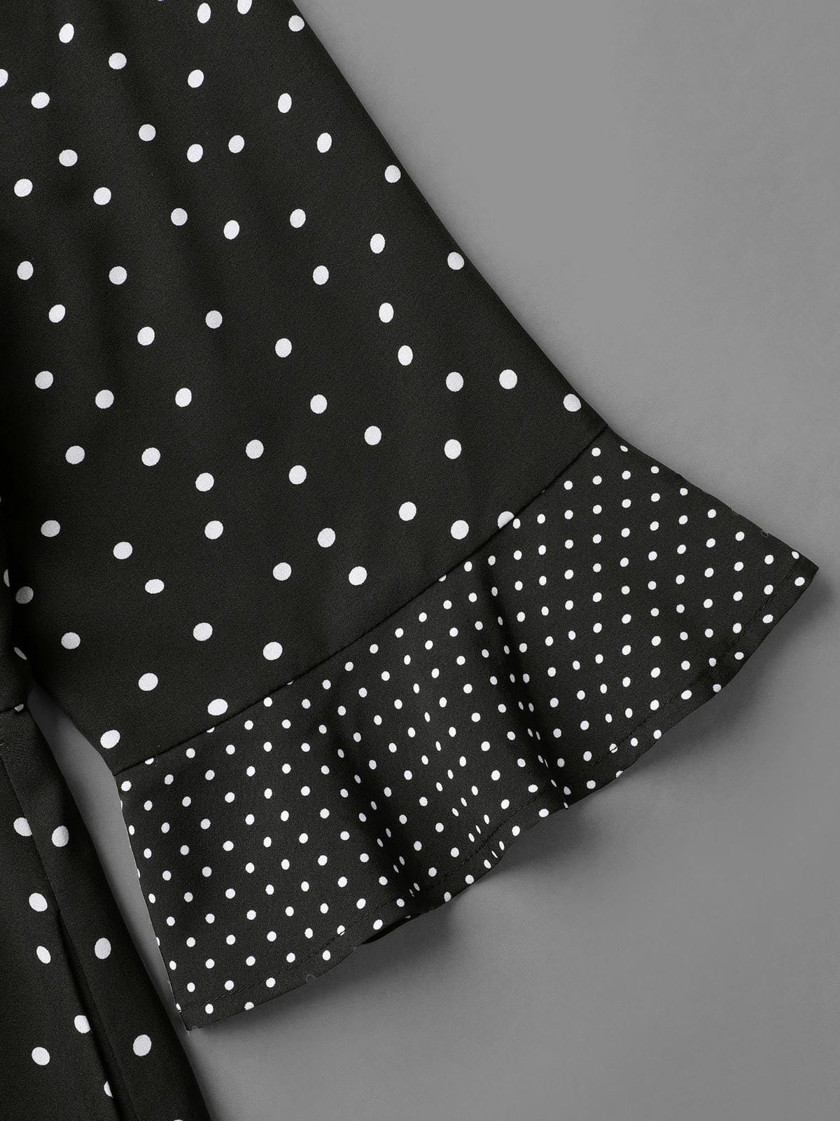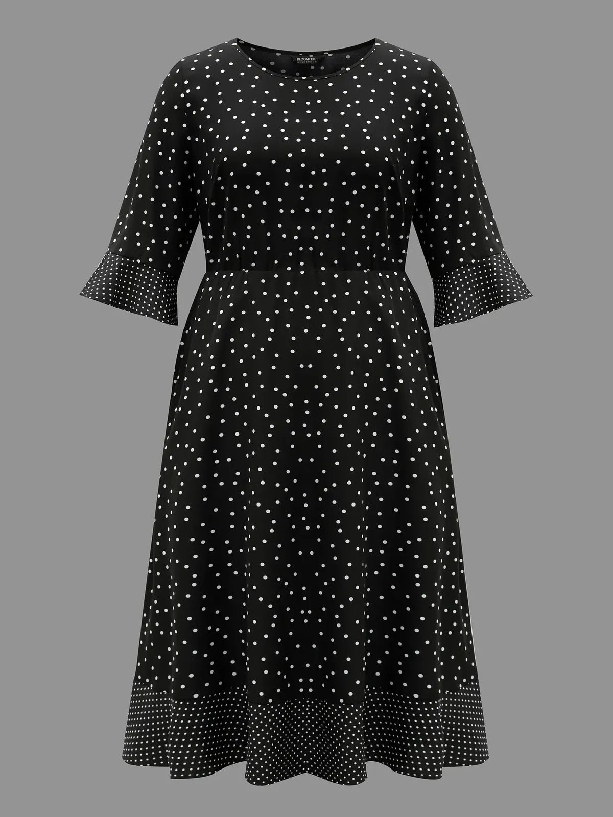 This is a black polka dot dress with a playful yet elegant vibe. It features a round neckline and 3/4 sleeves finished with contrast ruffle cuffs in a smaller dotted print, adding a chic twist to the classic pattern. The fitted waist creates a flattering shape, while the soft fabric offers comfort and ease. A versatile piece, this dress is perfect for casual outings, office wear, or a stylish day-to-night look.