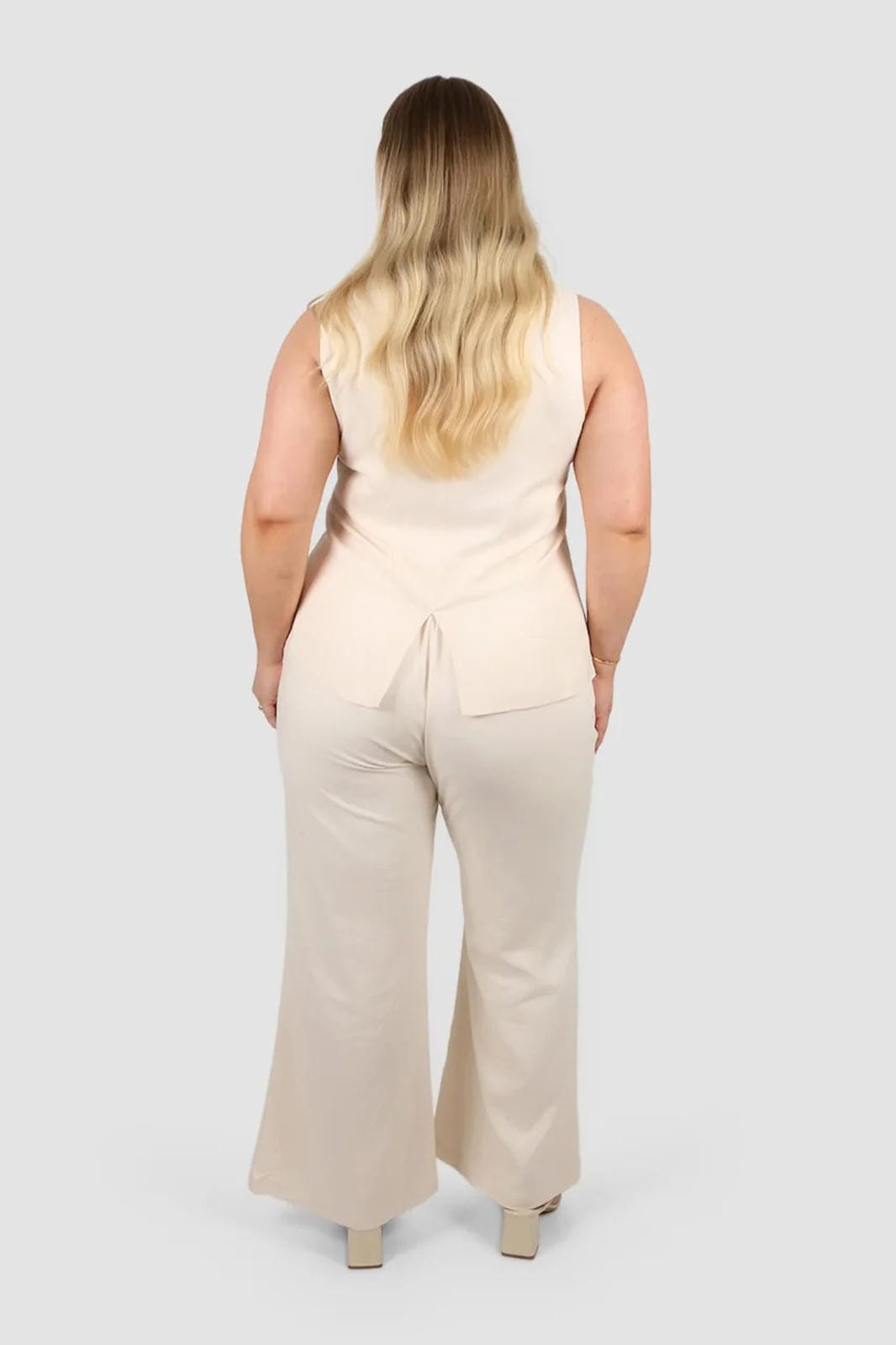 Effortless style meets modern tailoring in this beige co-ord set. The sleeveless top features a deep V-neckline with an asymmetrical hem and statement button detail, adding a contemporary edge to a timeless silhouette. Paired with high-waisted, wide-leg pants, this outfit offers comfort with a polished finish. Perfect for office wear, casual outings, or smart evening events, it can be elevated with strappy heels and minimal jewelry for a refined, versatile look