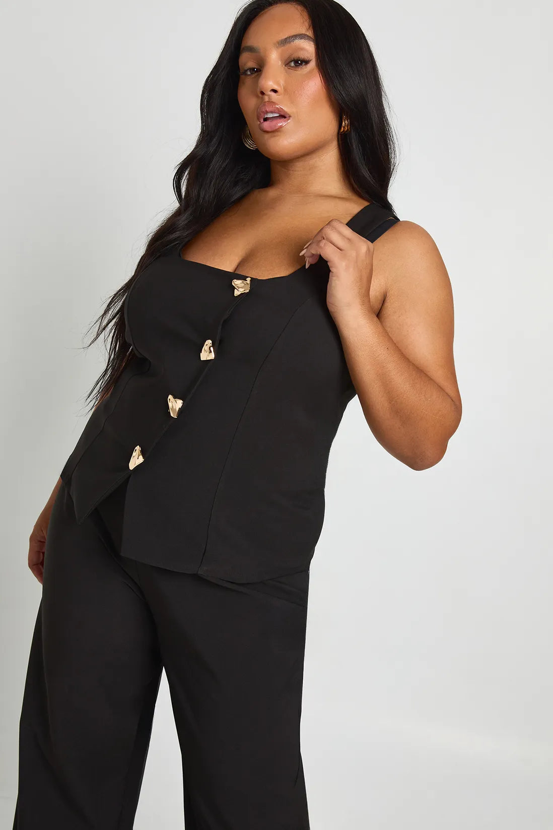 This chic black co-ord set is designed for effortless sophistication. The sleeveless top features a flattering square neckline and eye-catching gold statement buttons, creating a polished yet modern look. Paired with wide-leg trousers, the outfit delivers comfort with a tailored edge, making it perfect for both work and evening occasions. Styled with minimal accessories, it’s a versatile wardrobe staple that blends timeless elegance with contemporary flair.