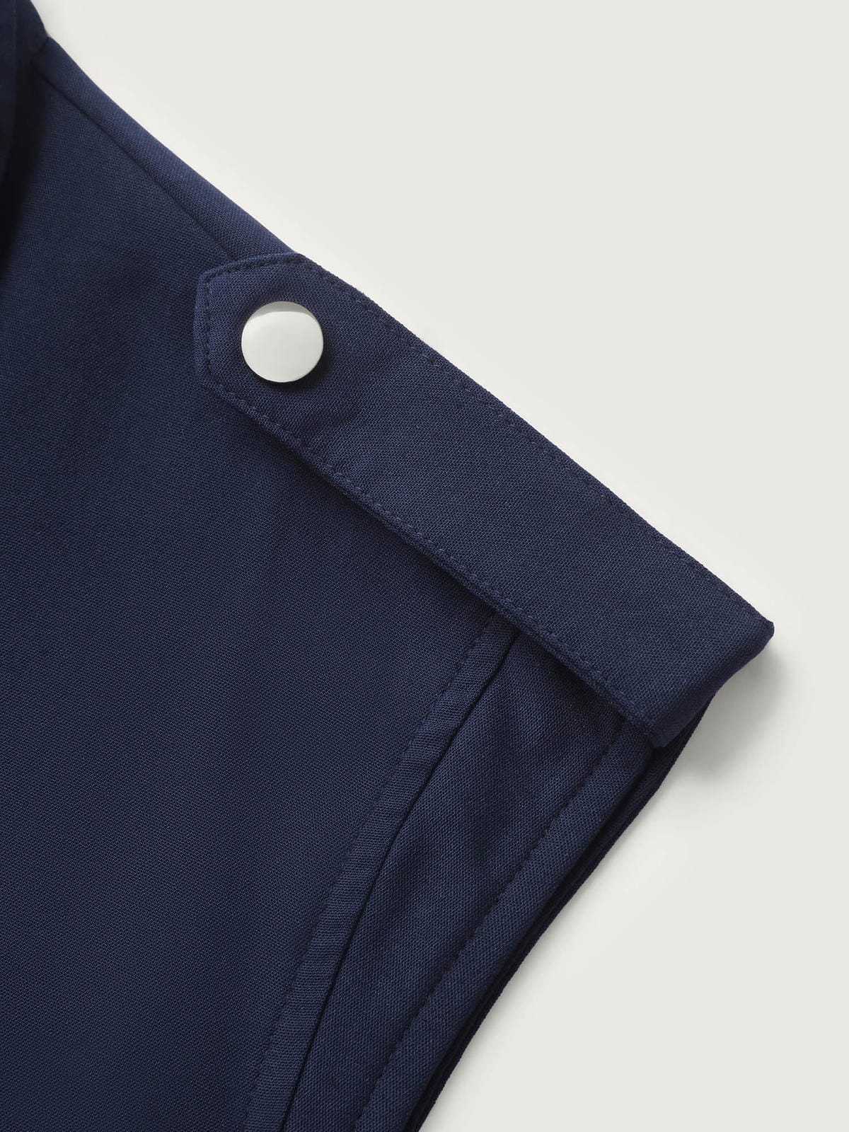 This navy blue midi dress combines chic utility style with timeless elegance. Featuring a collared neckline and cap sleeves, it’s designed with functional flap chest pockets and a sleek gold zip-front closure for a modern touch. The matching fabric belt cinches the waist, creating a flattering silhouette that flows into an A-line skirt with a graceful drape. Finished with side pockets for convenience, this versatile dress transitions seamlessly from workwear to weekend outings.