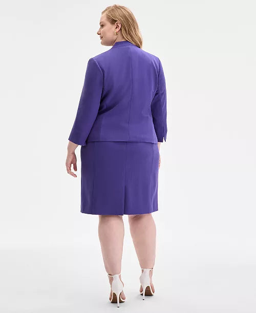 A sophisticated two-piece suit set in a striking purple shade, designed for a polished and confident look. The set features a knee-length sheath dress paired with a tailored open-front blazer. The jacket has a clean, structured silhouette with three-quarter sleeves, while the dress underneath offers a sleek, figure-flattering fit. Perfect for formal occasions, business meetings, or special events, this outfit balances professionalism with style.