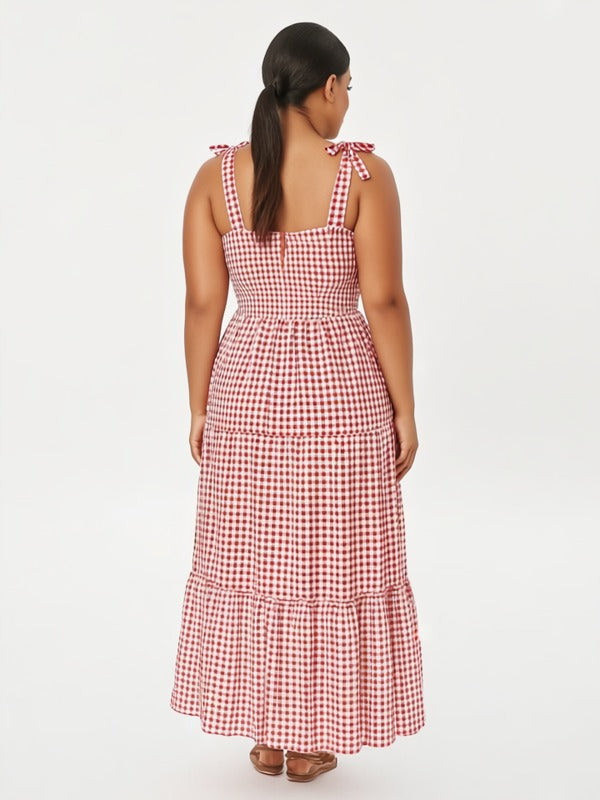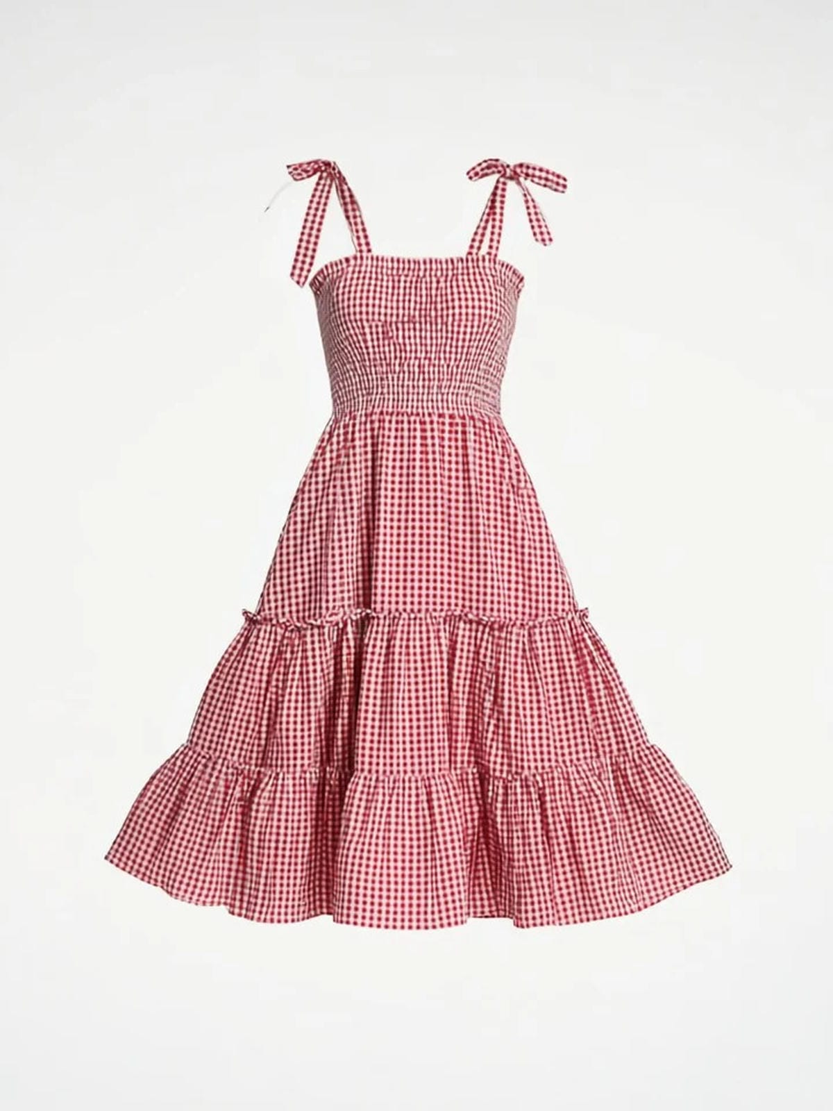 A charming, country-inspired gingham red and white check maxi dress with a casual yet feminine aesthetic.Smocked bodice offers a stretchy, comfortable, and flattering fit. Straight neckline with subtle ruffle edging along the top for a soft, playful touch. Shoulder straps: Tied bow straps on each shoulder, adjustable for comfort and styling variety.