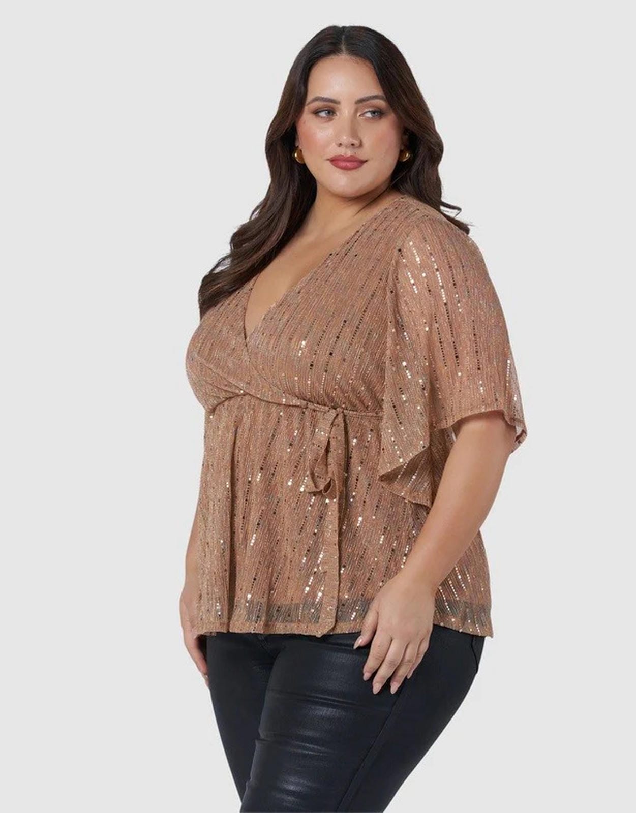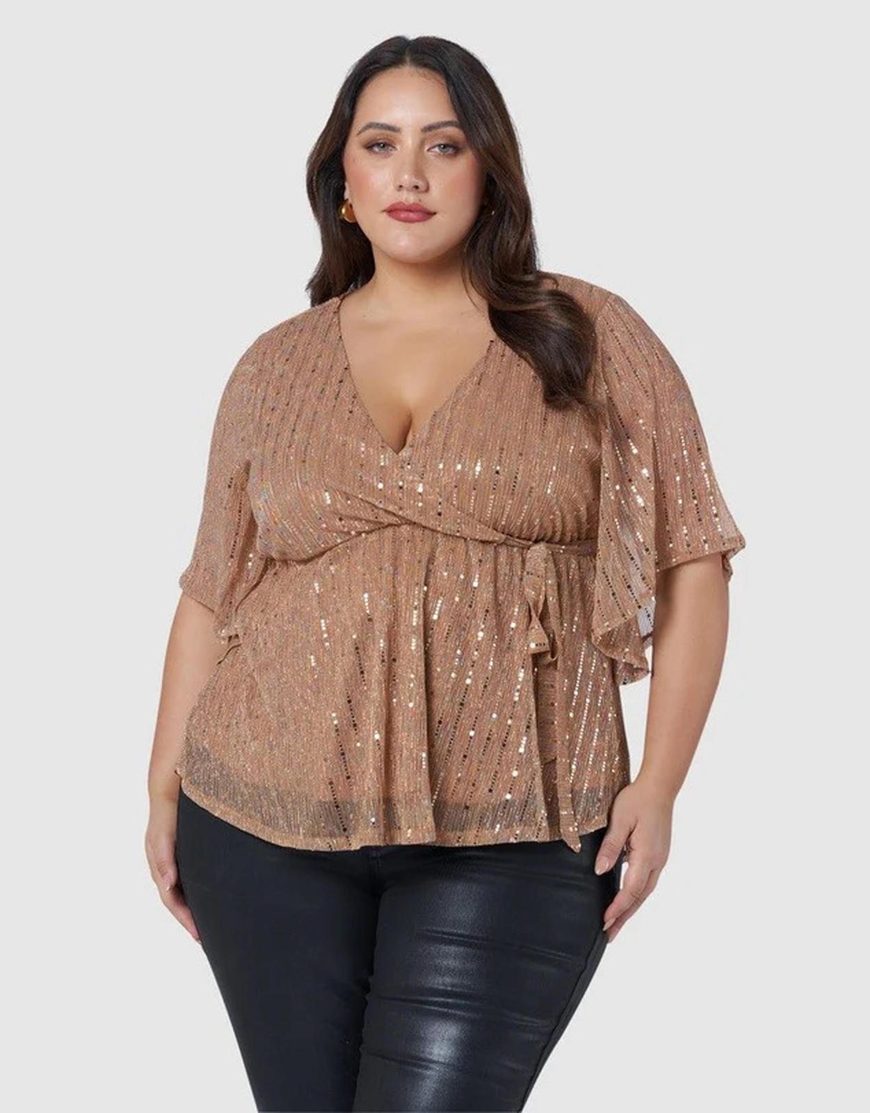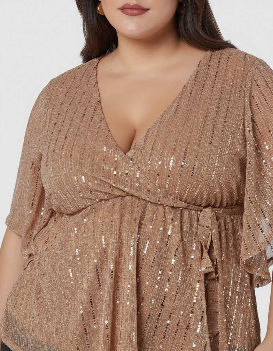 Elevate your evening style with this rose-gold sequin wrap top, designed to shimmer with every move. Featuring a deep V-neckline and flowy flutter sleeves, it strikes the perfect balance of glamour and comfort. The wrap-front silhouette cinches at the waist with a delicate side tie, creating a flattering peplum effect that highlights your curves. Lightweight and effortlessly chic, this top is ideal for parties, date nights, or festive celebrations where you want to shine.