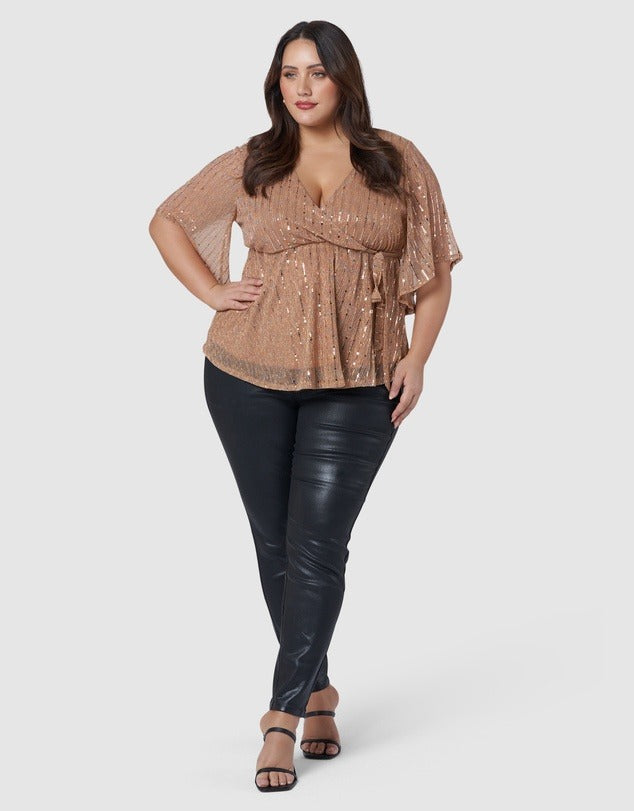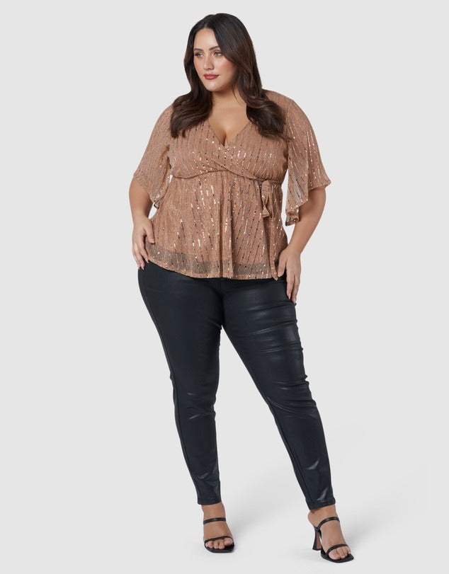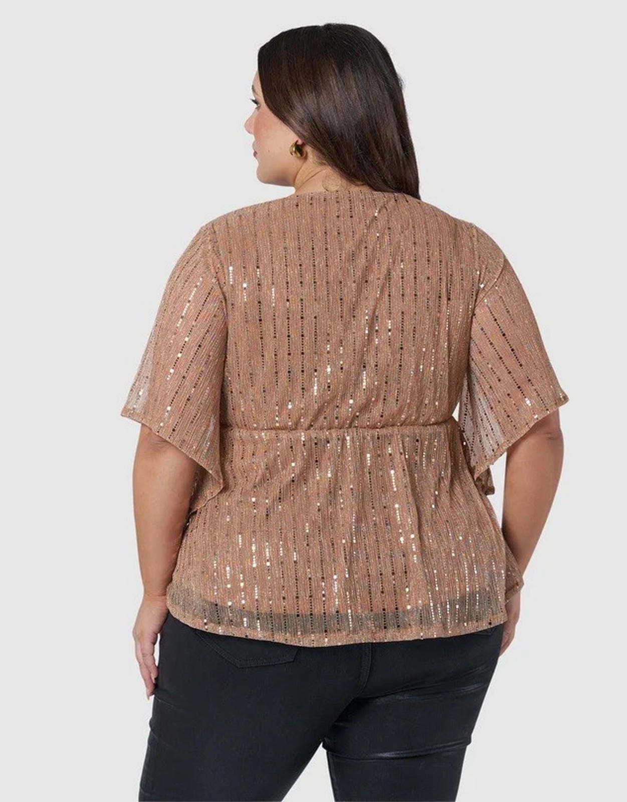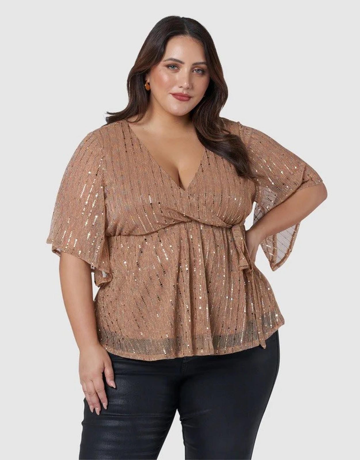 Elevate your evening style with this rose-gold sequin wrap top, designed to shimmer with every move. Featuring a deep V-neckline and flowy flutter sleeves, it strikes the perfect balance of glamour and comfort. The wrap-front silhouette cinches at the waist with a delicate side tie, creating a flattering peplum effect that highlights your curves. Lightweight and effortlessly chic, this top is ideal for parties, date nights, or festive celebrations where you want to shine.