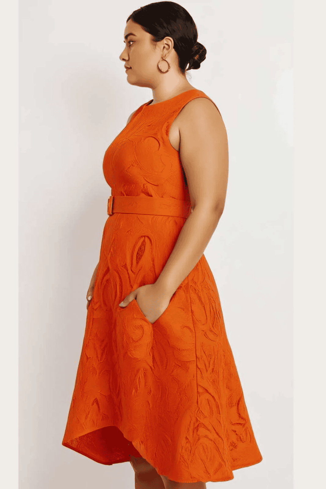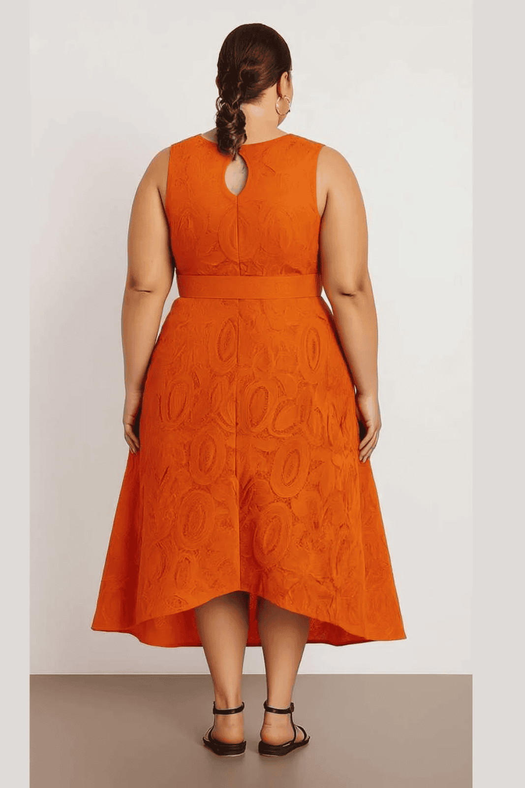 A sleeveless, bright orange lace dress featuring a high-low hemline and a matching belt at the waist. The textured lace fabric has an intricate circular pattern, adding visual interest and elegance. Perfect for formal or semi-formal occasions, this dress combines a bold color with flattering tailoring.