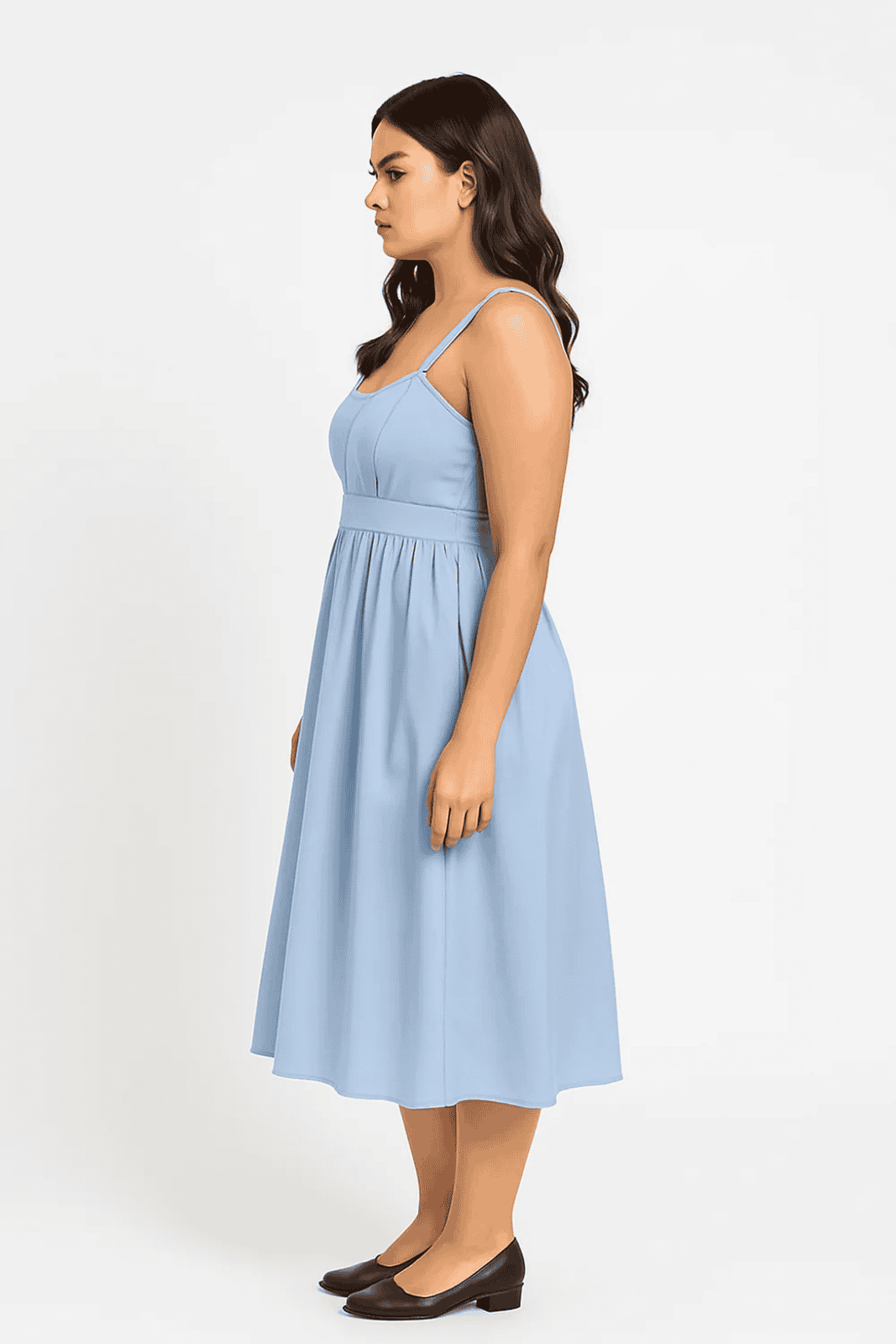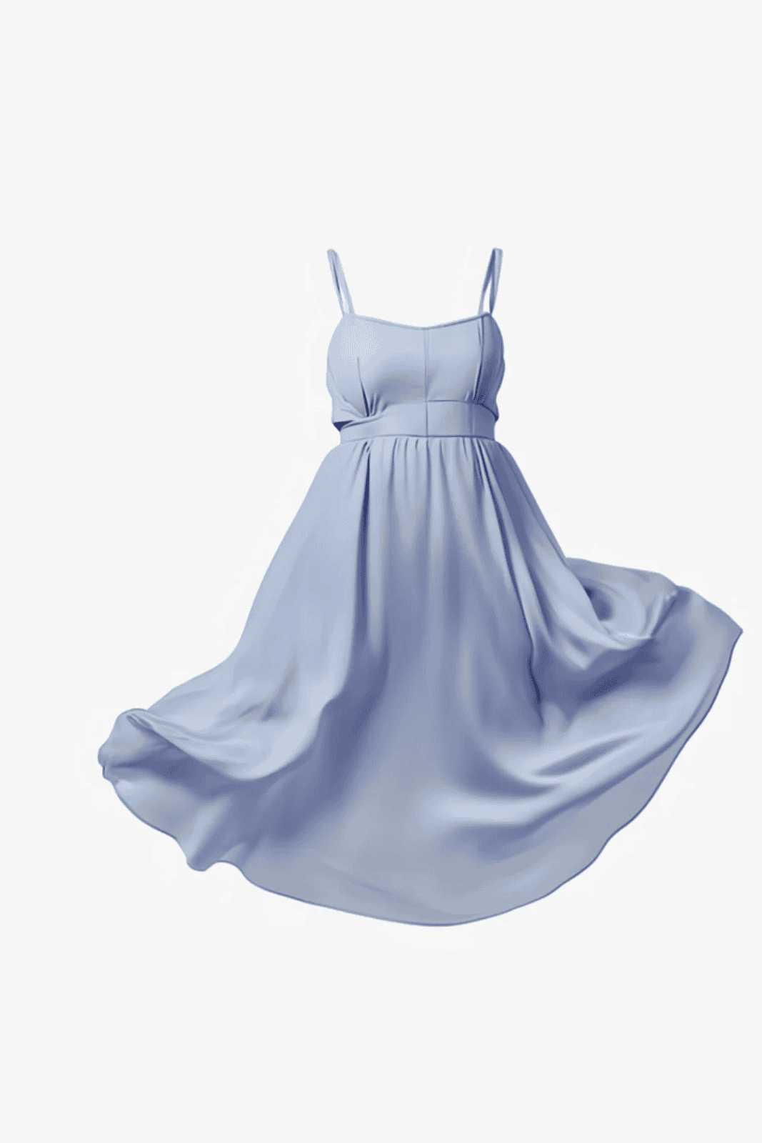 Elegant and timeless A-line gown Smooth, flowing satin fabric that offers a soft sheen and luxurious feel Soft pastel blue color Straight or slightly curved neckline with spaghetti straps Designed with a structured bodice and a high, defined waist to accentuate curves Flowing, full-length skirt that drapes beautifully and moves gracefully Lined for comfort and coverage.