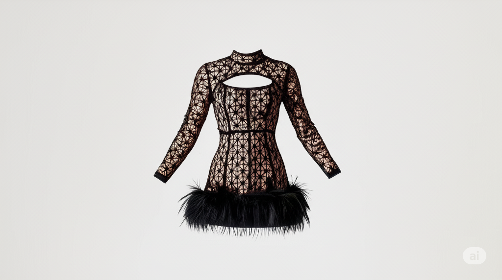 Turn heads in this stunning mini dress featuring a nude underlay with a black geometric lace overlay. Designed with a high neckline and a subtle front keyhole cutout, this dress brings the perfect balance of sophistication and allure. The sheer long sleeves add elegance, while the feather-trimmed hem gives a playful, high-fashion finish. The body con silhouette highlights your curves, making it an ideal choice for evening events, parties, or a night out.