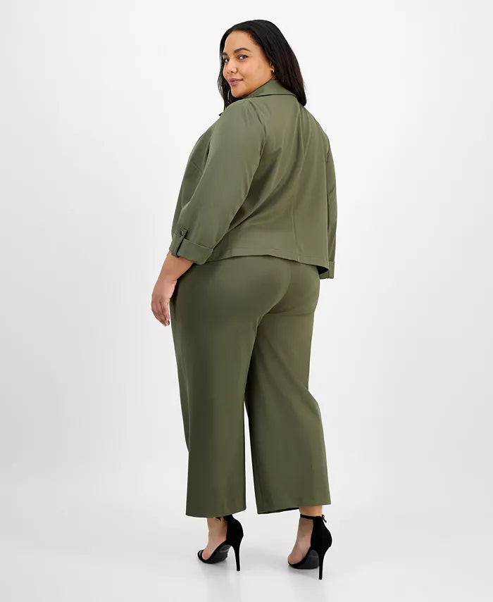 Step into effortless elegance with this chic plus size co-ord set in olive green. The outfit features wide-leg trousers paired with a relaxed-fit jacket, offering both comfort and structure. Styled with a vibrant printed blouse underneath, the look strikes the perfect balance between modern sophistication and bold flair. Ideal for work, casual outings, or smart evening events, this co-ord set redefines versatile dressing.
