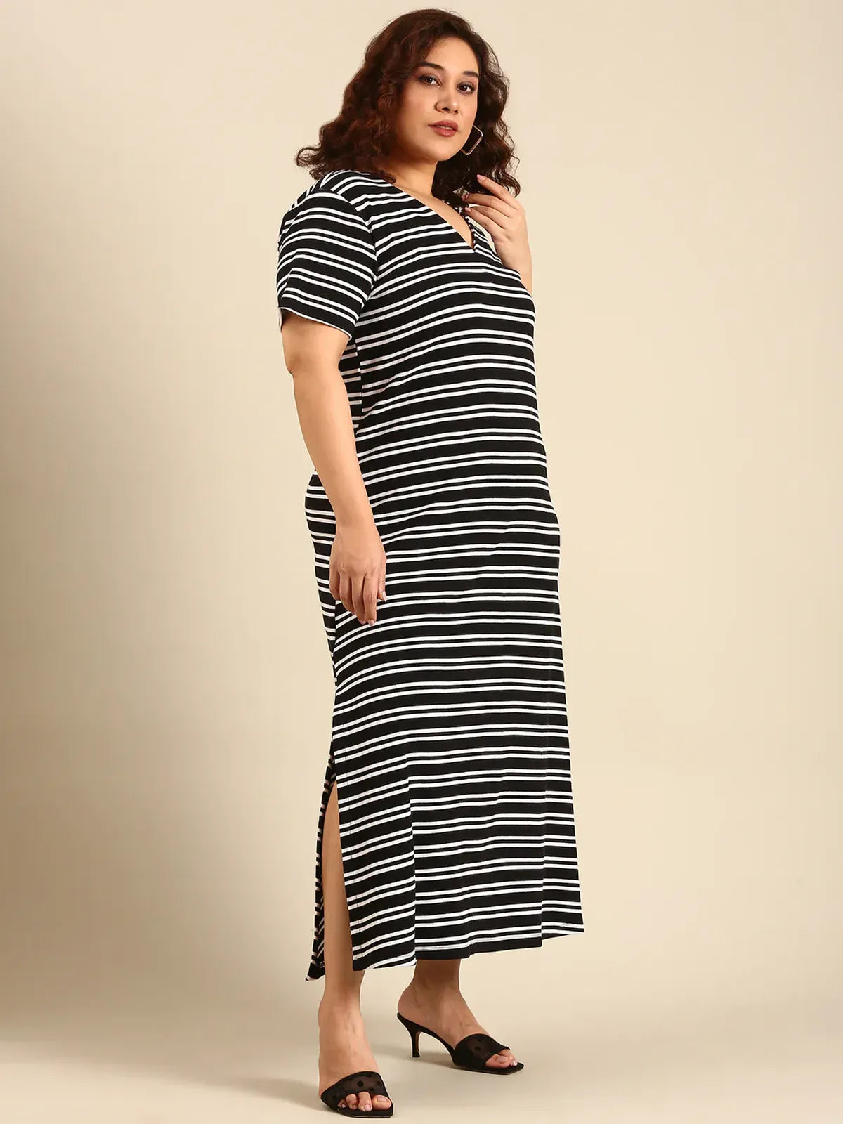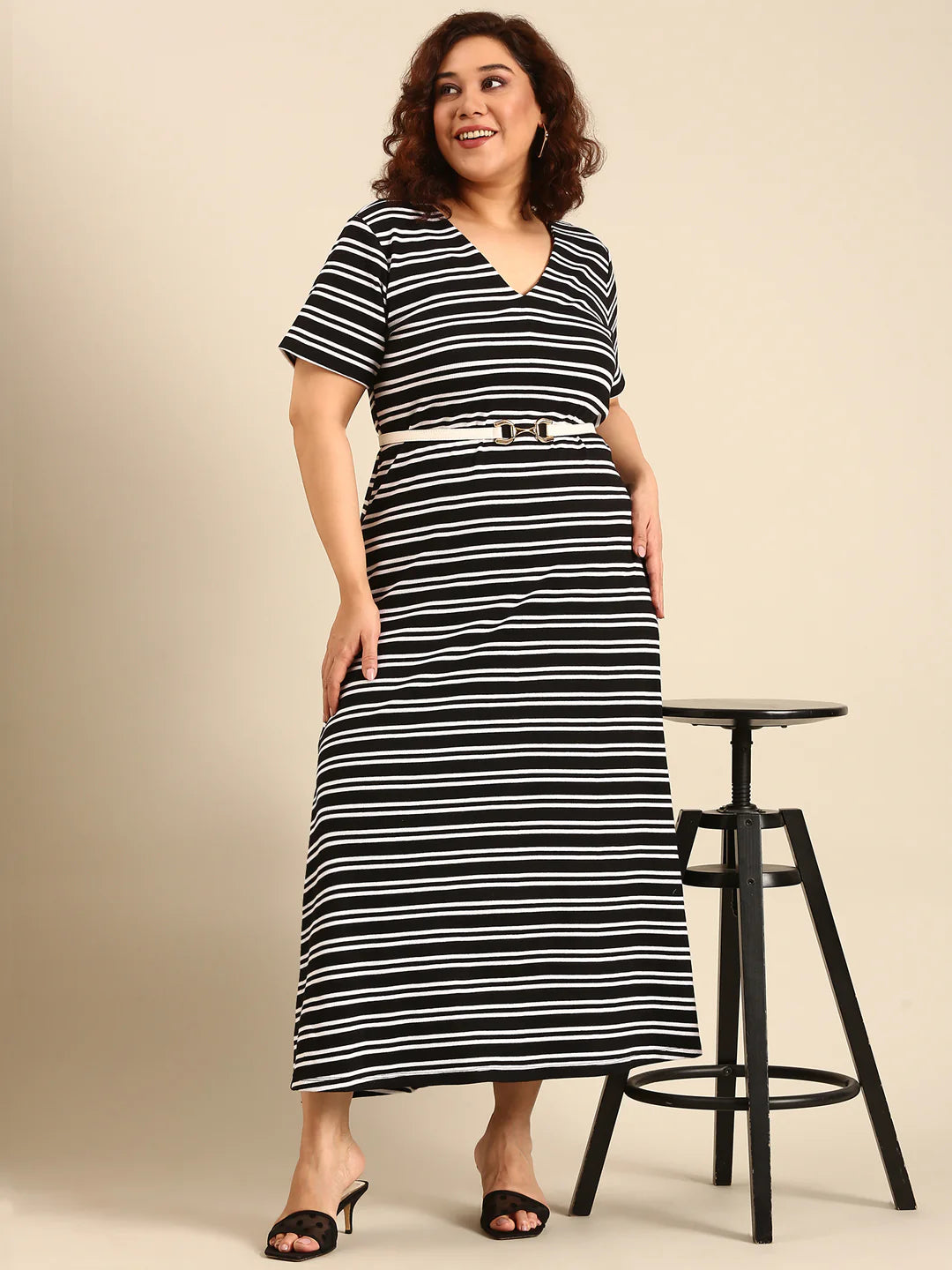 Make a striking statement with this black and white striped dress. Featuring a flattering V-neckline and classic half sleeves, it combines bold patterns with graceful simplicity. The flowing silhouette is designed to enhance plus-size curves, offering both comfort and timeless style.