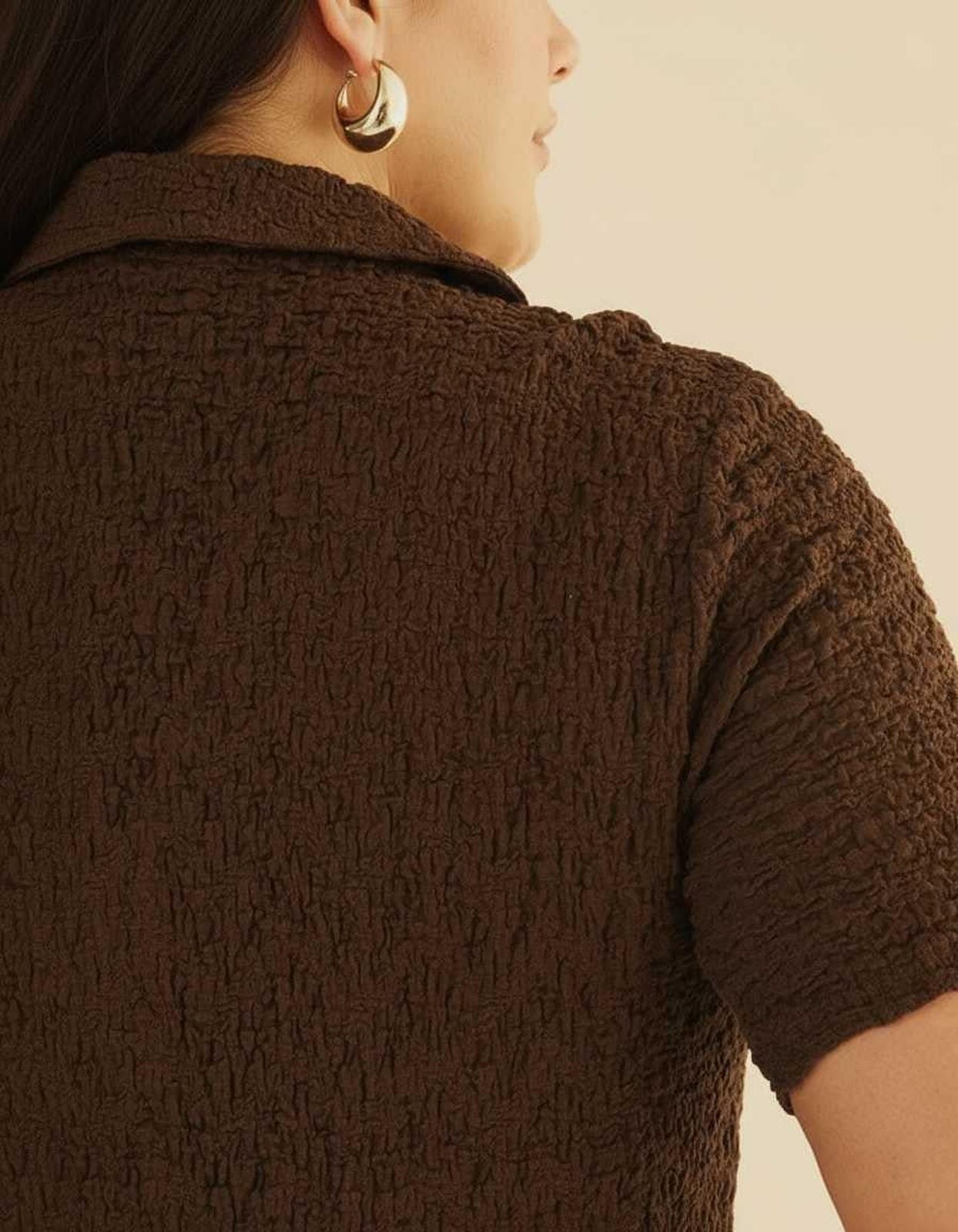 A stylish brown button-front blouse crafted from a textured, crinkle fabric that adds depth and dimension. It features a classic shirt collar, short sleeves, and a relaxed fit that gently contours the body. The lightweight, stretchable material offers comfort and ease of movement, making it perfect for casual outings or smart-casual looks. Pairs well with both trousers and skirts for versatile styling.