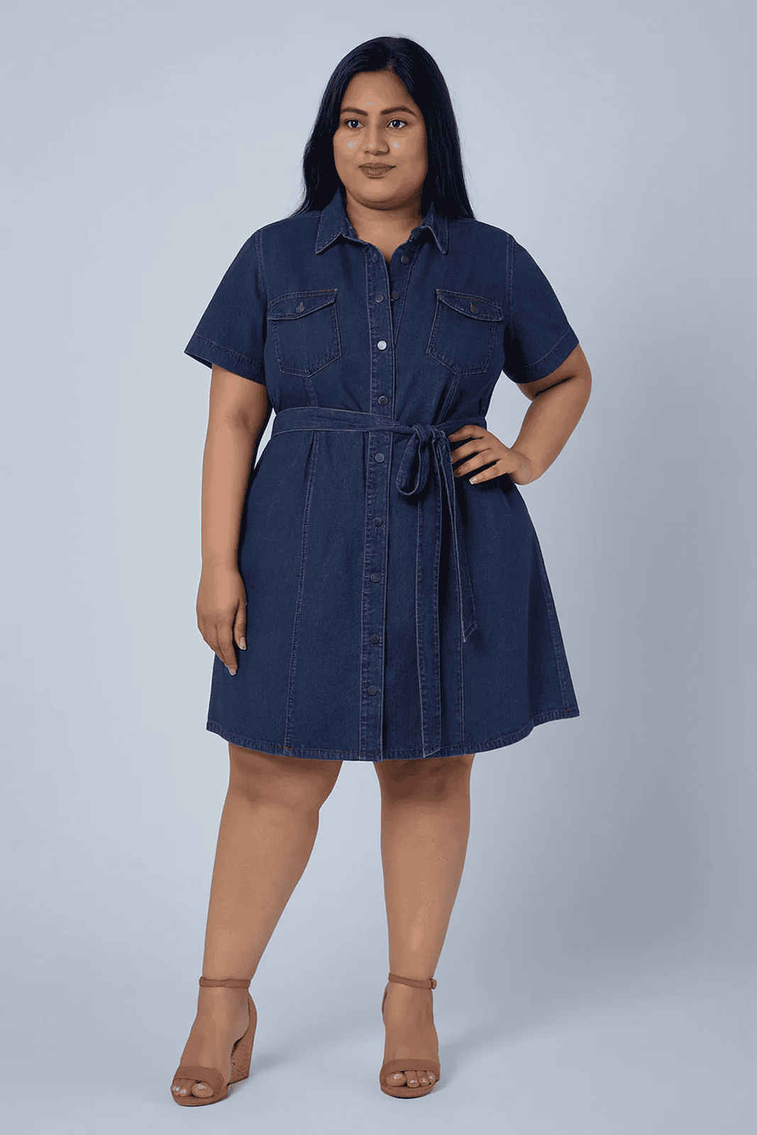 Crafted from structured dark-wash denim, this short-sleeve shirt dress features a button-down front, chest flap pockets, and a collared neckline for a classic utility-inspired vibe. The detachable self-tie belt cinches the waist, creating a flattering silhouette, while the A-line mini cut keeps it casual yet chic. Perfect for day outings or a laid-back evening look when paired with wedges or sneakers.