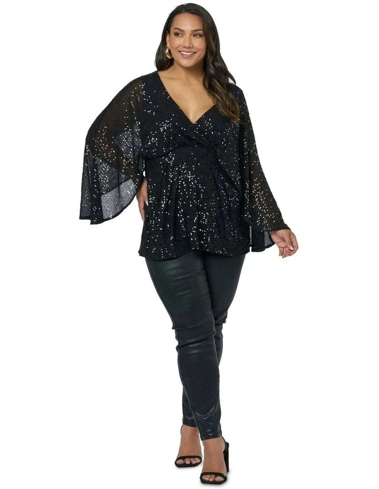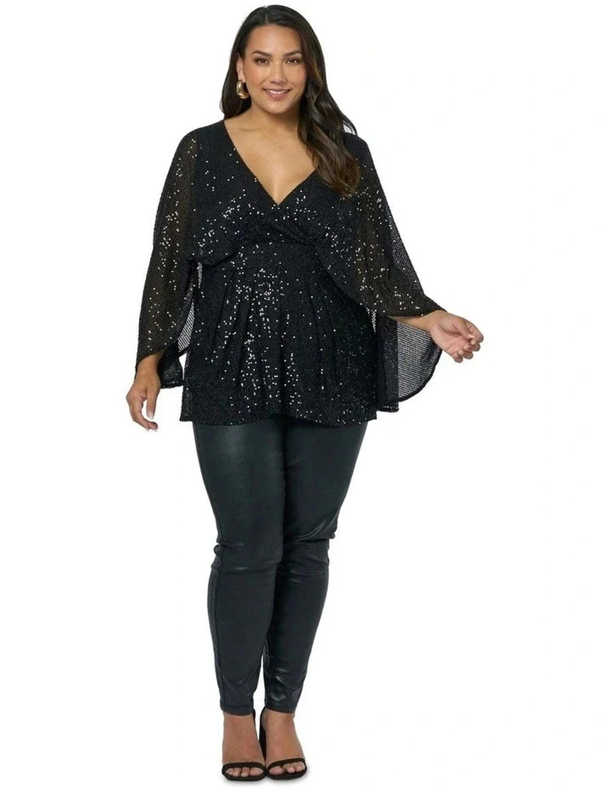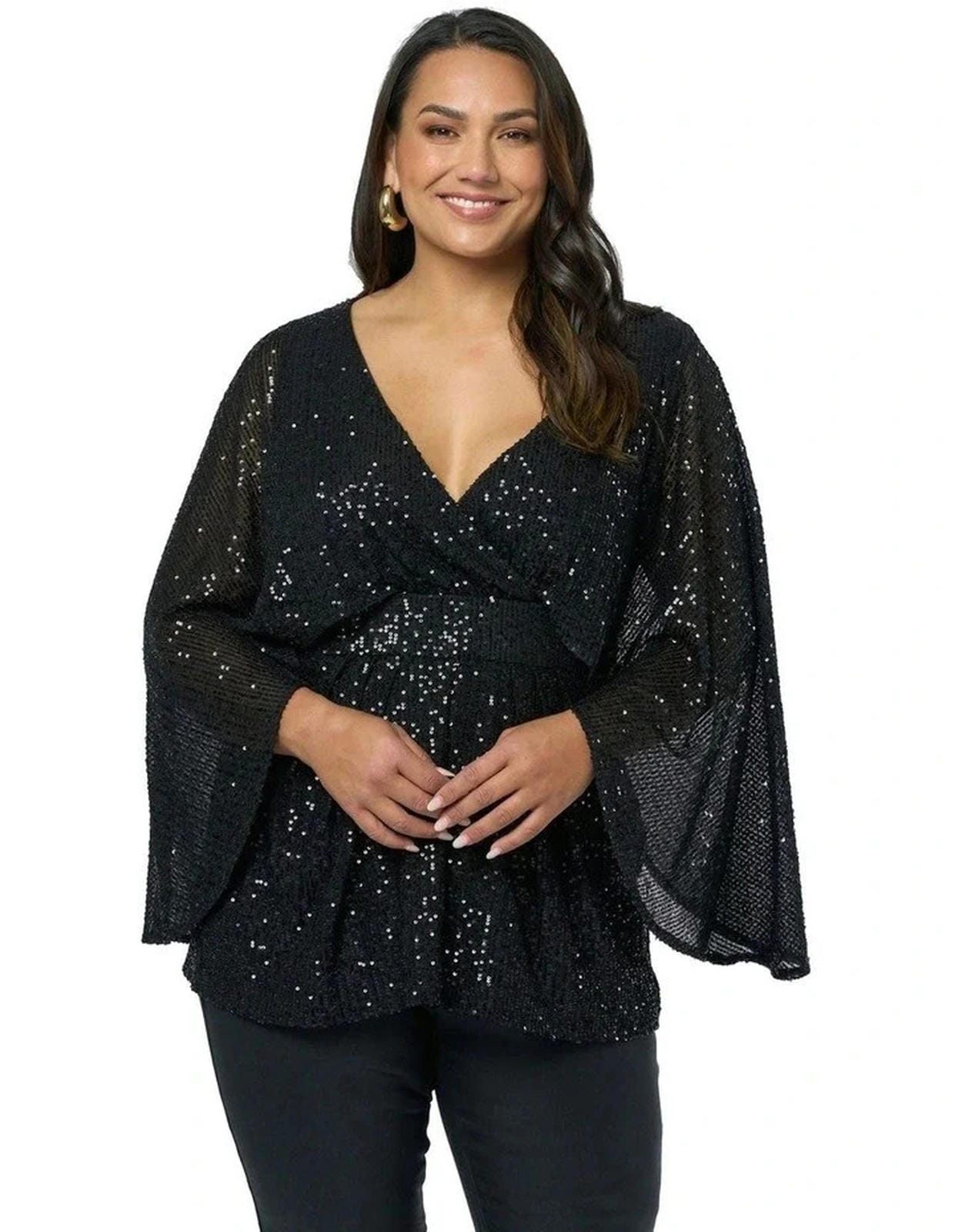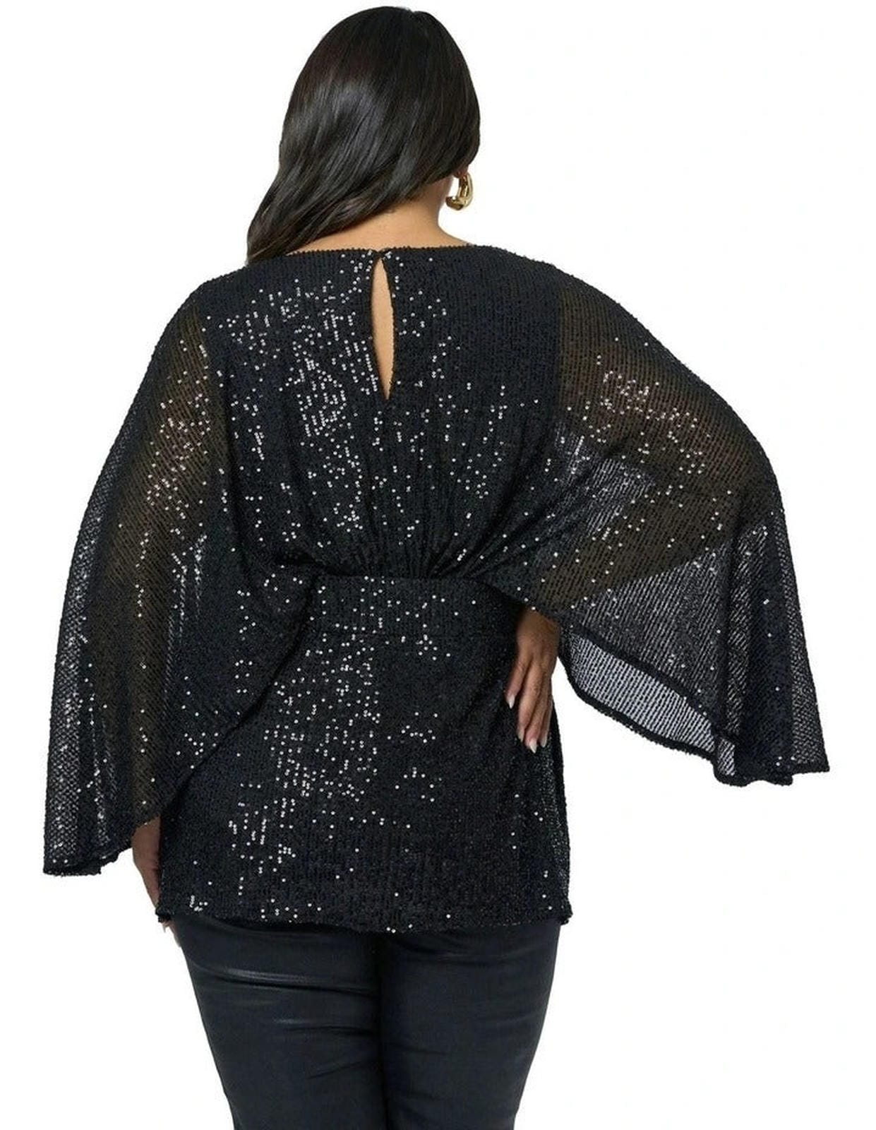 Turn heads in this black sequin wrap top, designed to bring effortless glamour to your evening look. Crafted with all-over shimmering sequins, this statement piece features a flattering V-neckline and long sleeves for a touch of sophistication. The wrap-style silhouette enhances curves beautifully, creating a chic yet comfortable fit. Perfect for parties, special occasions, or a night out, this top is your go-to for adding instant sparkle and confidence to your wardrobe.