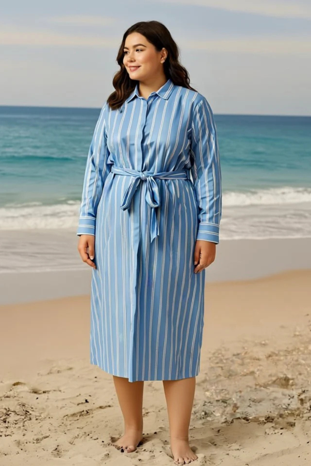 The dress is a knee-length shirt dress featuring long sleeves with cuffs and a classic collar. It has a light blue base color with vertical white stripes running throughout. The dress includes a matching fabric belt tied at the waist, accentuating the silhouette. The material appears lightweight and comfortable, suitable for casual or semi-formal occasions.